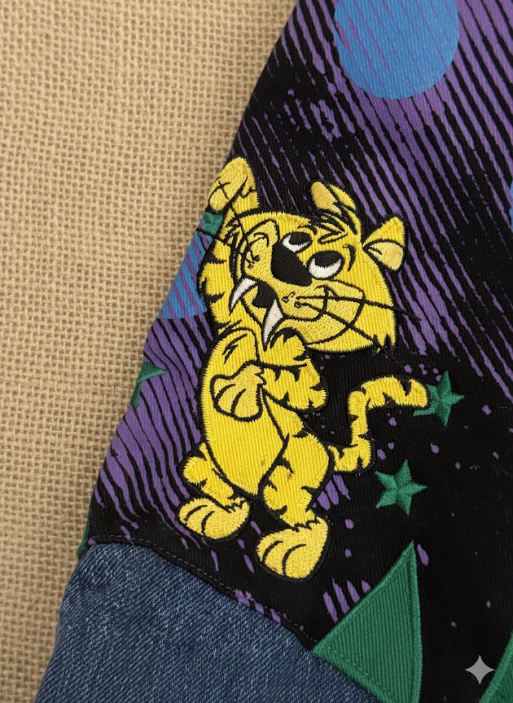 Renkli patchler, çizgi karakter teması ve vintage dokusu ile koleksiyonluk değerde özel bir tasarım.