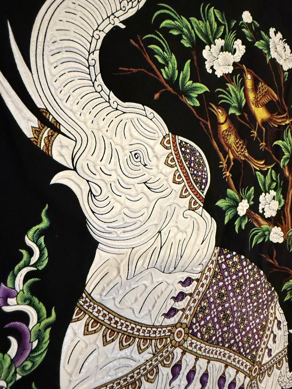 MD My Dream markasına ait, Uzak Doğu ve Tayland kültüründen ilham alan tişört. Ön kısmında, Tay sanatının zarafetiyle işlenmiş, bezenmiş ve süslenmiş görkemli bir Beyaz Fil (Chang Thai) figürü yer alır. Filin çevresindeki beyaz çiçekler ve altın-kahve tonlarındaki kuşlar ile mor-yeşil kıvrımlı süslemeler, baskıya zengin ve mistik bir hava katar. Arka kısmında ise, geleneksel Tay motifleriyle yazılmış "Thailand" yazısı bulunur. Siyah, sade kumaşı üzerindeki bu detaylı ve renkli baskı, tişörtü dikkat çekici bir seyahat ve kültür parçası yapar.